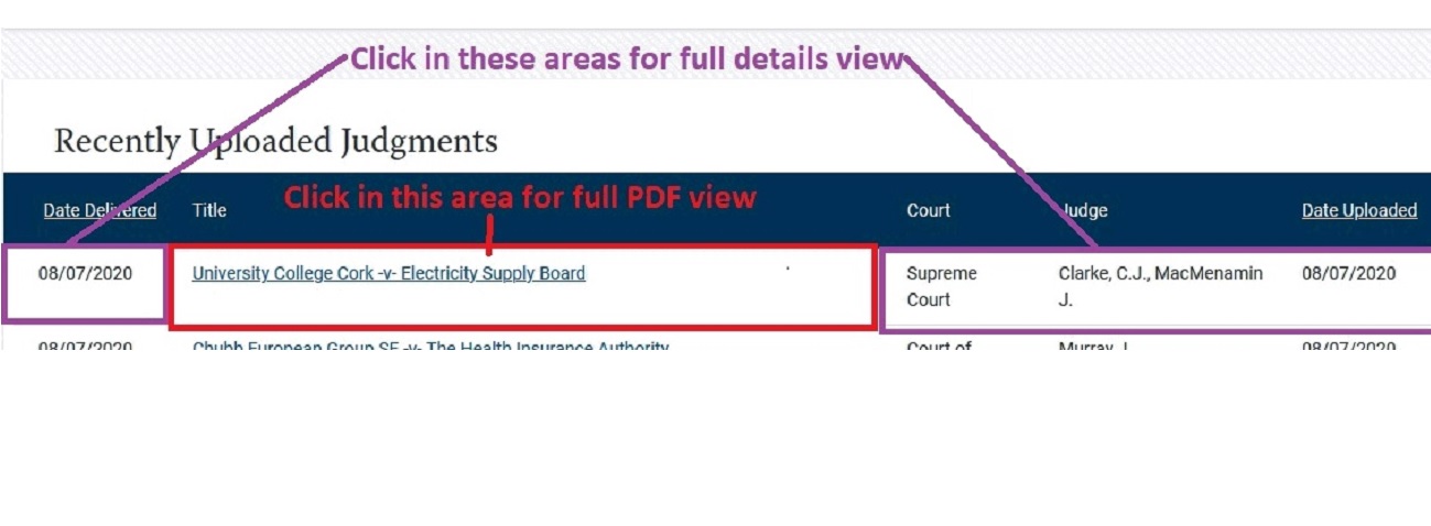 The image below describes the display of judgments on this page.  Click into the judgment Title area of each judgment for a full-screen version of the judgment.  Click into the other headings (Date Delivered/Court/Judge/Date Uploaded) for the full details view.